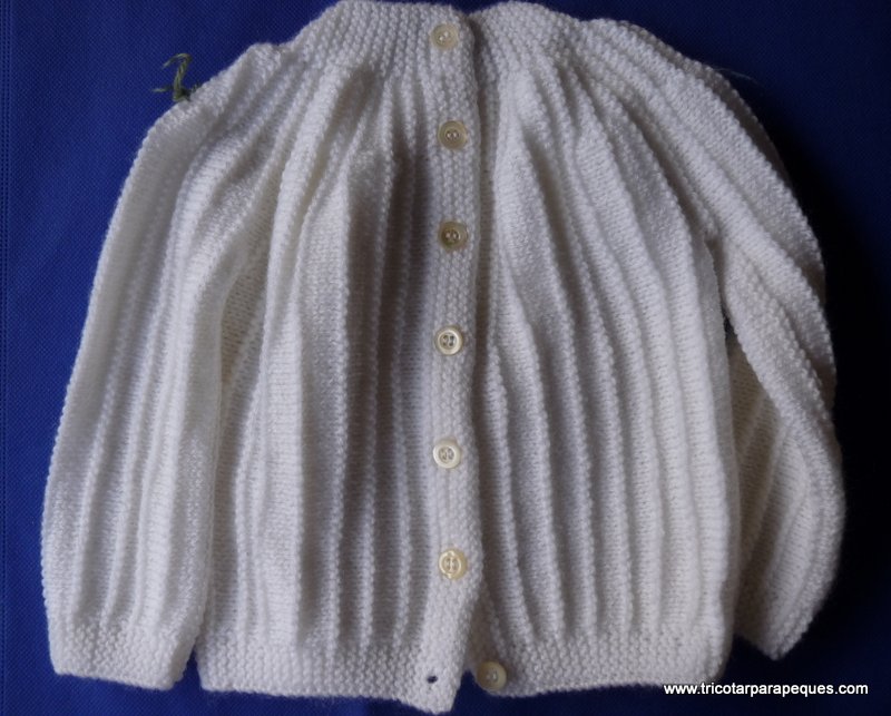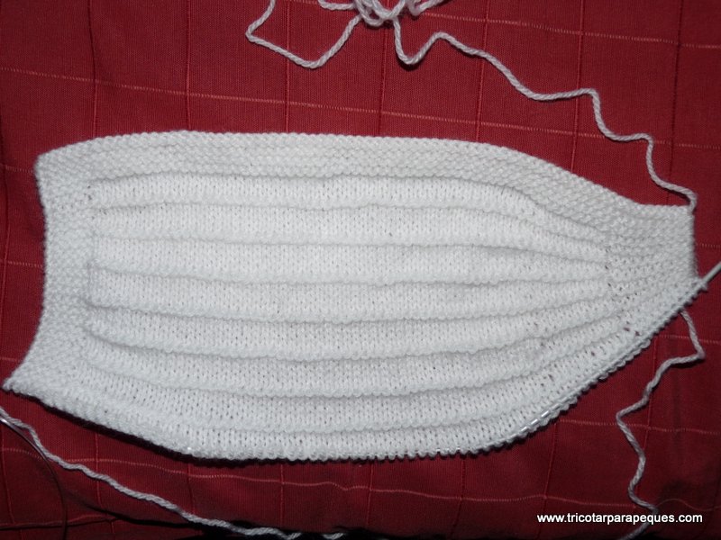 Se trabaja al través, empezando por la media espalda derecha. Montar 74 puntos en la aguja del número 3 y trabajar a punto siempre derecho, 8 vueltas (tapeta botones).