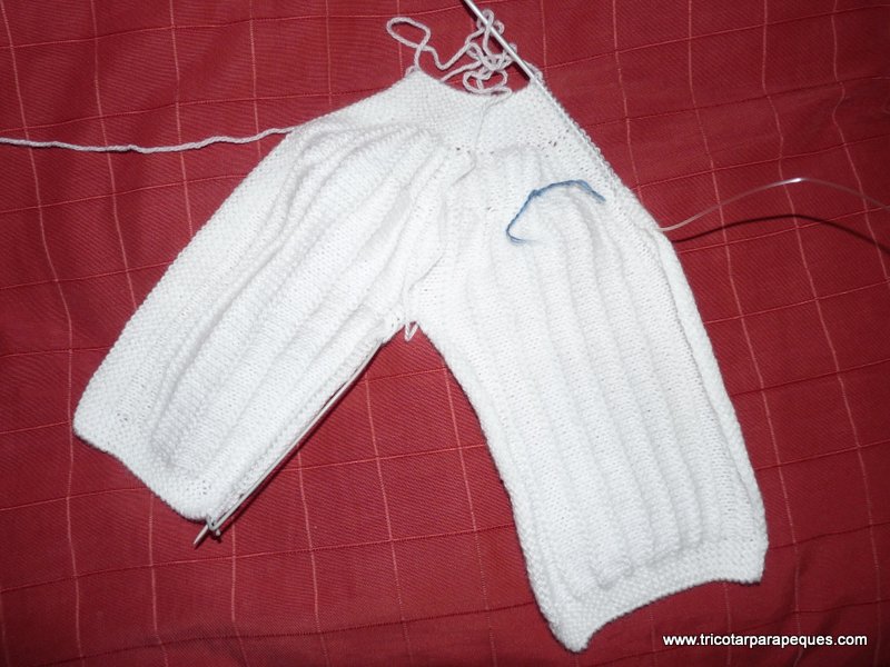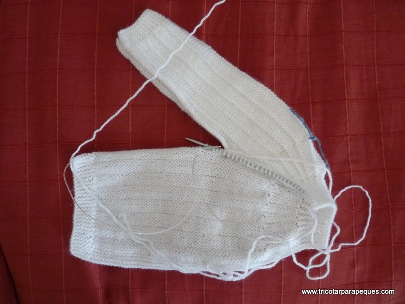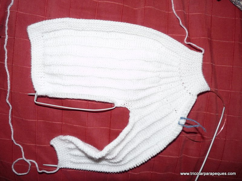 A continuación, empezando por el bajo (Vuelta 1) seguir en punto derecho tricotando solamente 56 puntos, quedan sin hacer, 9p + 9p (canesú y cuello). Volver en punto revés (Vuelta 2), salvo los 6 p del bajo que siempre serán al derecho.