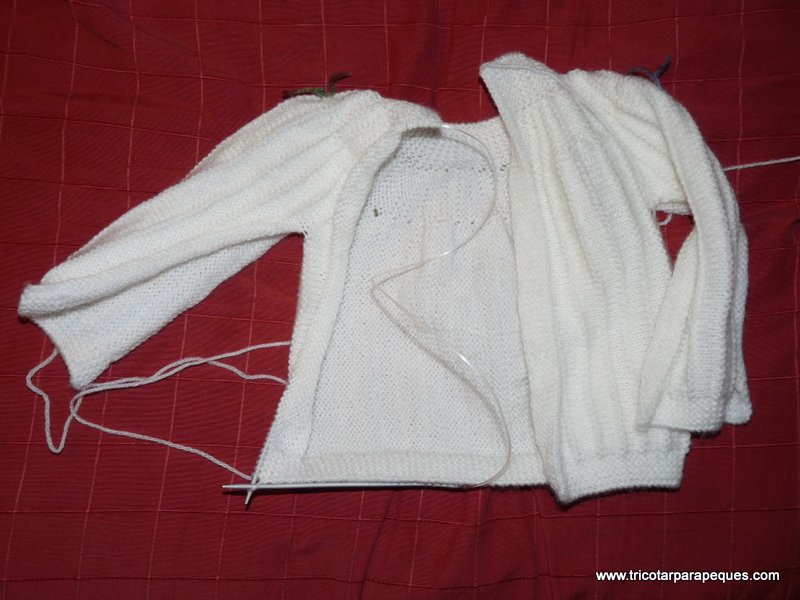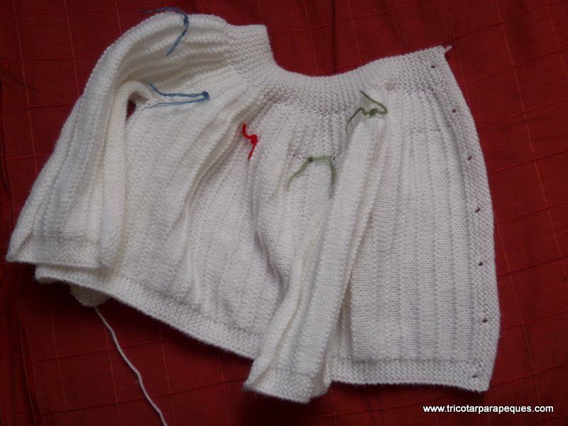Seguir la espalda, y después de 53 líneas de relieve, tricotar 4 vueltas normalmente y 8 vueltas todo al derecho para tapeta de 7 ojales, repartiendo ojales a lo largo (4p derecho, un ojal, 11p, un ojal, etc) (Ojal: un arrollado, dos puntos juntos).