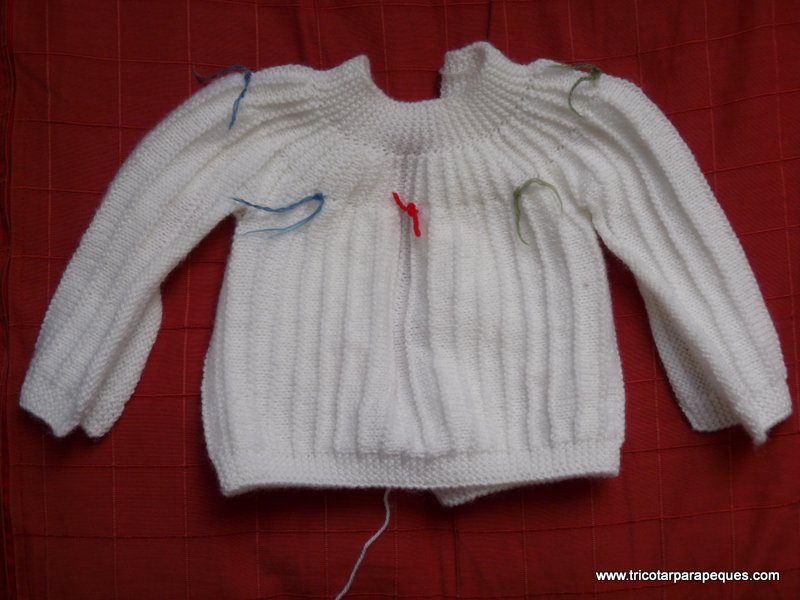 En este punto, recomiendo poner una señal de color (azul en la foto). Desde la señal en línea 13 hasta la línea 21, bajaremos un punto el canesú cada vez que tricotemos la pasada más corta, tricotando dos puntos juntos (el punto 18 con el 19 desde el cuello) en total 9 veces. Así el cuello delantero quedará más escotado que el el escote de detrás. A 18 líneas de relieve, cerraremos los 45 puntos de la manga. Quedan en la aguja 9p + 9p + 9p descontando los 6 puntos disminuídos, y volveremos a poner en la aguja los 41 puntos en espera que vienen de la espalda. Es importante calcular bien en qué vuelta lo realizamos, para que el dibujo quede correcto. Seguimos el delantero como siempre, las disminuciones hasta las 9 veces, marcando de nuevo el final en la línea 21 (azul en foto), y sin disminuir más hasta el centro, que marcaremos con otra señal (rojo en foto), en la línea de relieve 27.