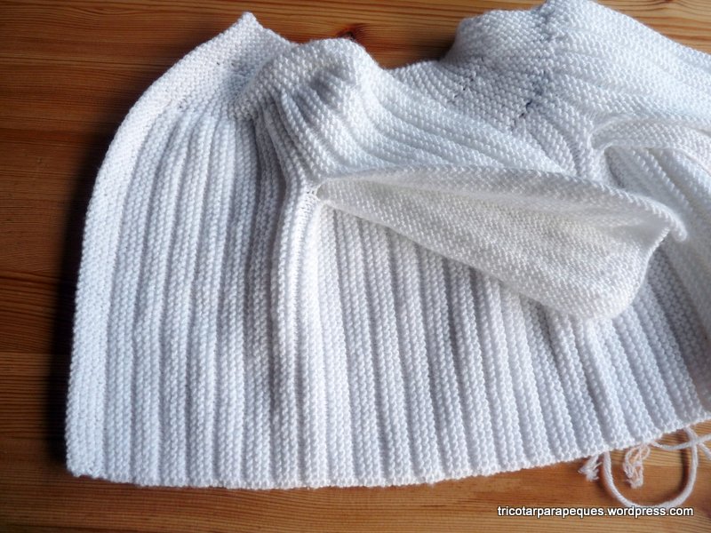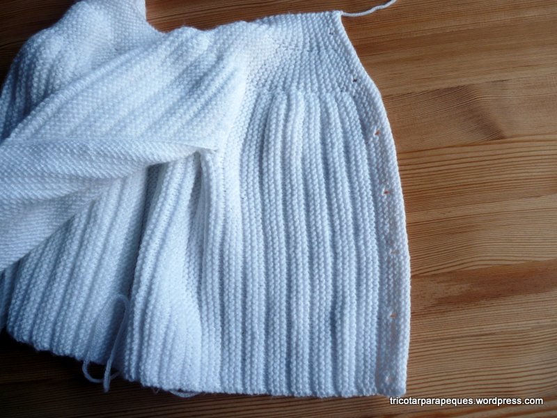 Cuando tengamos unos 25 cm, tendremos el delantero completo, dejaremos de nuevo 41p en espera, menos los que falten para completar la subida del cuello, que iremos aumentando todavía. Tricotar la segunda manga añadiendo los 45p como antes, y repetir todo simétricamente.