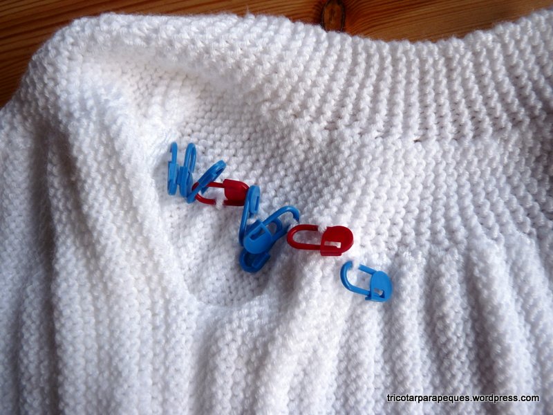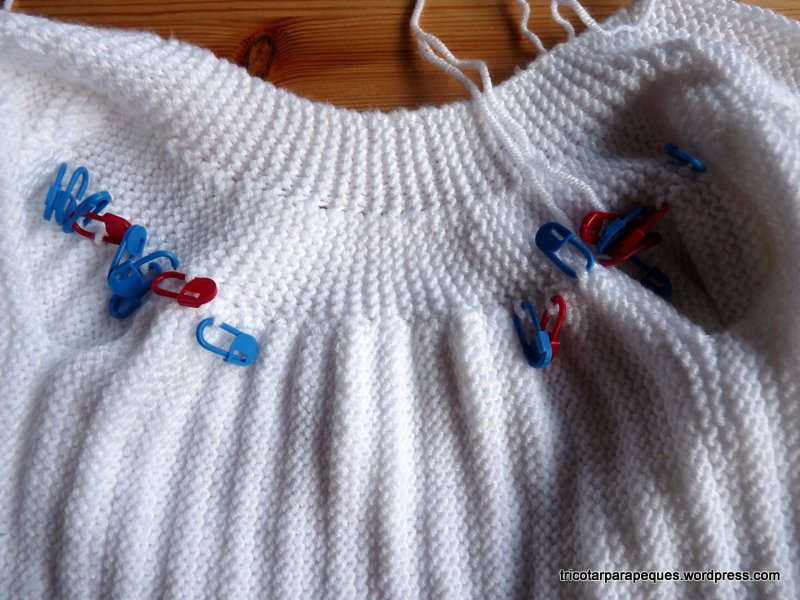 Seguimos ahora con el delantero, mismo sistema, continuamos bajando el escote 1p cada vez hasta un total de 9p cada 8 vueltas, y luego sin cambios hasta tener unos 12-13 cm. En este momento estamos en la mitad del delantero. Ponemos una marca en el centro, para repetir en este lado lo que ahora serán aumentos, para «subir» 9 p el escote, un punto junto al canesú cada 8 vueltas. En la foto las marcas de subir y bajar el escote se ven en el revés del jersey, porque las colgaba de la hebra al tricotar por el derecho, con la hebra detrás.