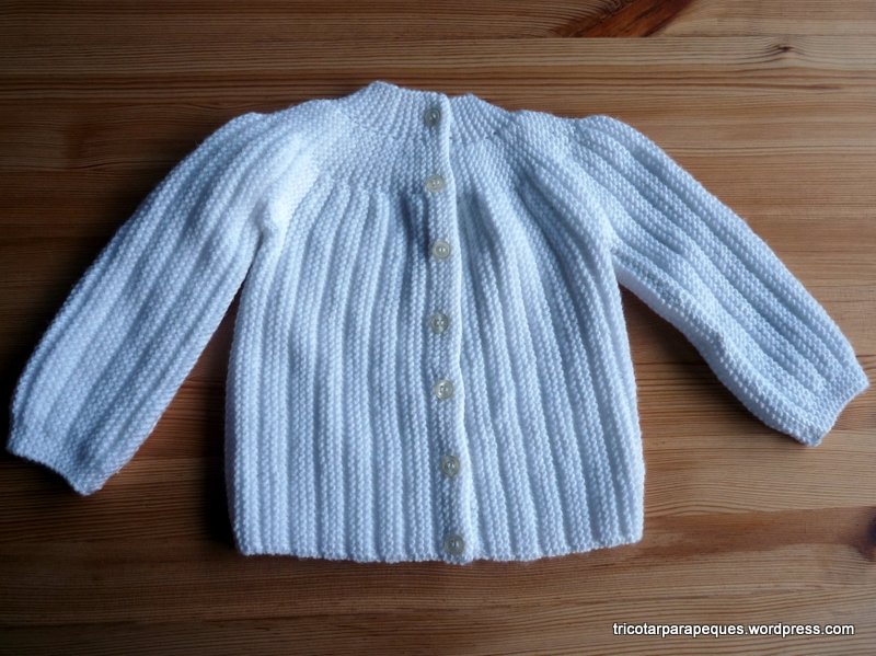 Montaje de puntos: Montar, en la aguja de 3mm, 74 puntos. Tricotar todo al derecho hasta tener 4 relieves (8 vueltas) para la tapeta de botones (espalda lado derecho). La forma del jersey la van a dar las diferentes vueltas: son 2 vueltas al derecho siempre, hasta el cuello, se tricotan los 74 puntos, 2 vueltas al derecho tricotando solamente 65 puntos para cuerpo y canesú, y 4 vueltas sobre 56 puntos, 3 de ellas al derecho y una al volver, tricotada a punto revés, para el cuerpo. Todo el jersey se hace repitiendo estas 8 vueltas.