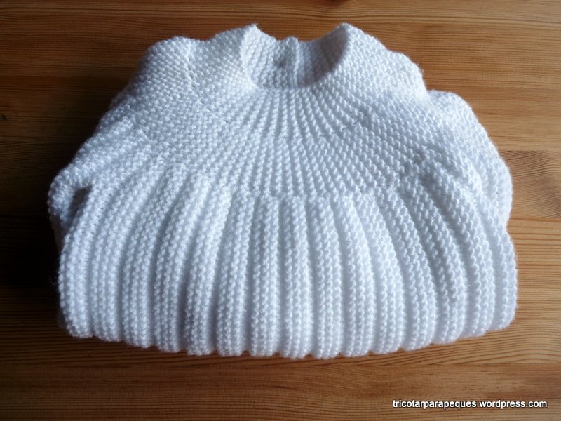 Jersey muy adaptable, sin costuras laterales, en una sola pieza, para bebés de 3-6 meses. Se realiza fácilmente, por el método de las vueltas largas, medias y cortas, para ir dando la forma al cuello, canesú y cuerpo.