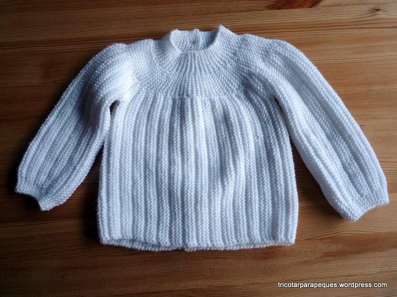 Jersey muy adaptable, sin costuras laterales, en una sola pieza, para bebés de 3-6 meses. Se realiza fácilmente, por el método de las vueltas largas, medias y cortas, para ir dando la forma al cuello, canesú y cuerpo.