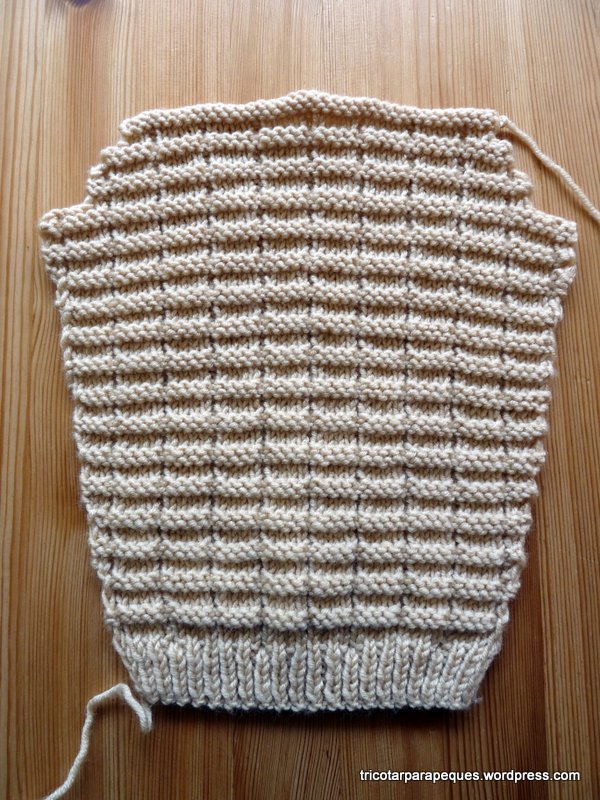 Espalda: Montar 66 puntos para la espalda. Tricotar a punto canalé 3,5 cm. Pasar al punto en relieve, hasta tener 25 cm en total. Para las sisas, cerrar 5p en cada lado, y seguir recto, otros 13 cm. Dejar en el centro 20 puntos en espera para el escote, en una aguja imperdible larga.