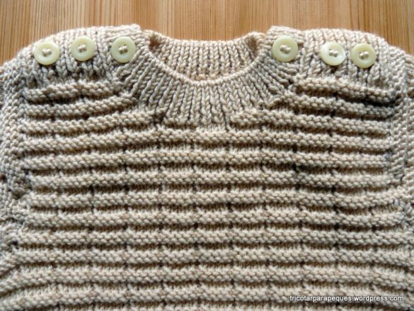 Después de 3 relieves del escote, pasar a canalé en los lados y hay que hacer 2 ojales centrados, separados por 4 puntos. Seguir hasta 3,5cm, y cerrar a aguja los hombros.