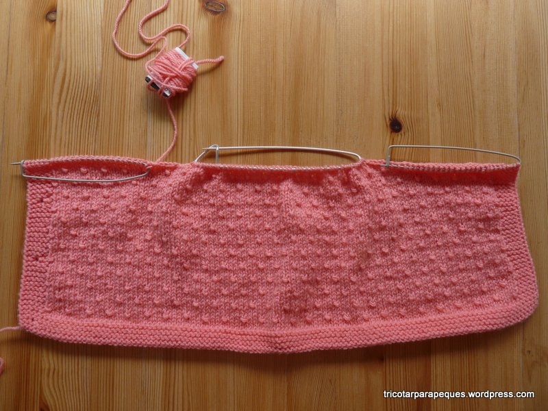 Seguir todo recto hasta tener 18 cm. Hemos llegado a las sisas. Para poder colocar las mangas, cerraremos 4p separando el delantero y las dos espaldas, tricotando: 6p + 21p, cerrar 4p, 51p, cerrar 4p, 21p + 6p. Volver hasta la primera sisa, 27p, para dejar la hebra cortada en la sisa y no en el borde. Dejar todos los puntos en espera hasta tener las mangas a punto. Tenemos en espera 27p, 51p, 27p.
