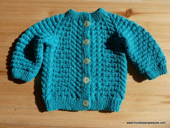 La chaqueta va trabajada en una sola pieza, las mangas se hacen por separado hasta las sisas. Se unen al cuerpo dejando una trenza a cada lado de las mangas, y suben hasta el cuello.
