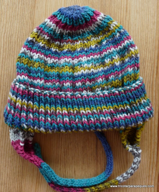 El cordón de atar de hace con estos 4p, y las mismas agujas. Por el derecho, se hacen los 4p al derecho. Cuando los tenemos en la aguja derecha, se pasan a la aguja izquierda, y se vuelven a hacer los cuatro puntos al derecho, tomando la hebra desde la aguja izquierda en el 4º punto tricotado, estirando un poco. Se repite este paso de la aguja derecha a la izquierda tricotando los 4p, tantas veces como sea necesario hasta tener un cordón de 20-21cm. Cerrar el cordón cosiendo el extremo. Coser las orejeras al gorro a unos 8cm del centro de detrás, separadas entre ellas por unos 16cm, un poco más adentro del pliegue del bajo.