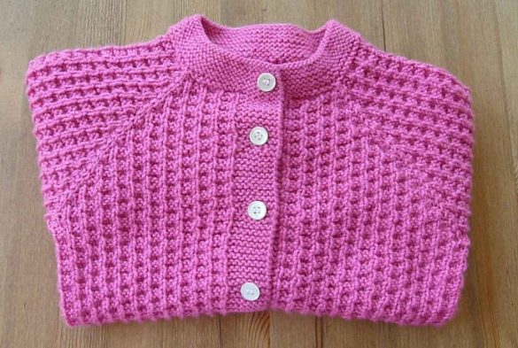 Puntos empleados: Punto siempre derecho en cuello, tapetas de ojales y botones, y bajo. Punto canalé 1p derecho / 1p revés, en los puños. Punto en relieve, 4p derecho, 2p revés, 4p derecho … toda la vuelta. Volver tricotando los puntos tal como se presentan. Vuelta tercera, 1p derecho, 2p revés, 4p derecho, 2p revés… La cuarta vuelta, tal como vienen los puntos. Repetir estas 4 vueltas.