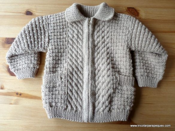 Cuello: Recoger todos los puntos del escote delantero, de la espalda y del otro escote delantero. Pinchar algún punto más en los «saltos» o huecos, y 7p en cada lateral del escote delantero. En total, 75p. Es mejor tener un número impar, para que el cuello quede simétrico en los dos bordes. Empezar el canalé con la aguja de 3mm, hasta tener 3cm. Luego con aguja de 4mm, tricotar 2,5cm más, después 1cm con aguja de 4,5mm y finalmente, 0,5cm con la aguja de 5mm. Así el cuello no queda tirante, y se abre mejor. Cerrarlo con aguja lanera según se explica en mis Trucos y consejos, si se sabe hacer.