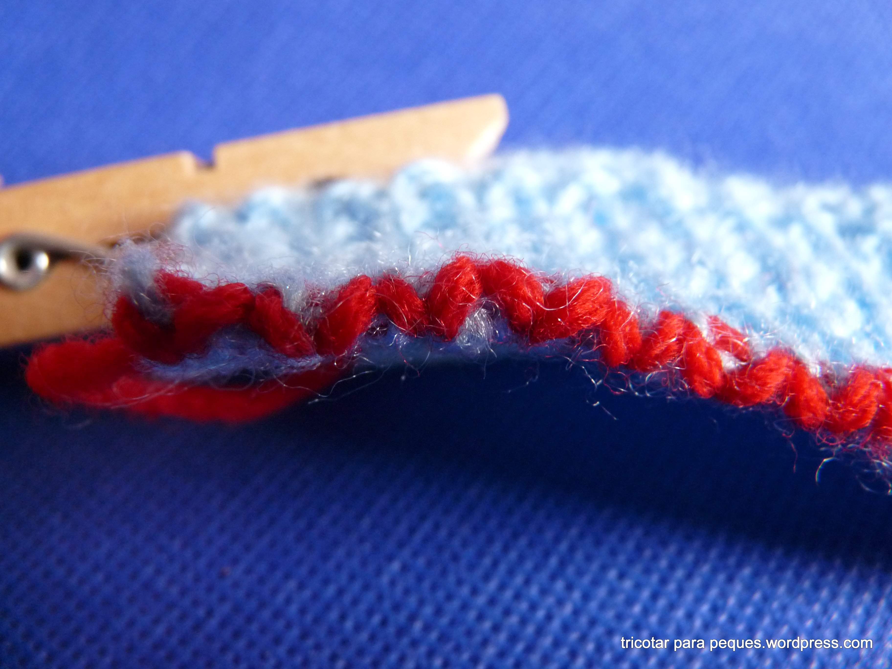 Esta técnica tiene su dificultad. Pero es imprescindible para cerrar un canalé sin que quede una cadeneta de cierre en el borde, y además queda elástico y bien acabado. Vale la pena practicar con una muestra para ganar habilidad. La lana roja, para que se vea mejor, es el resultado del trabajo con la aguja lanera.