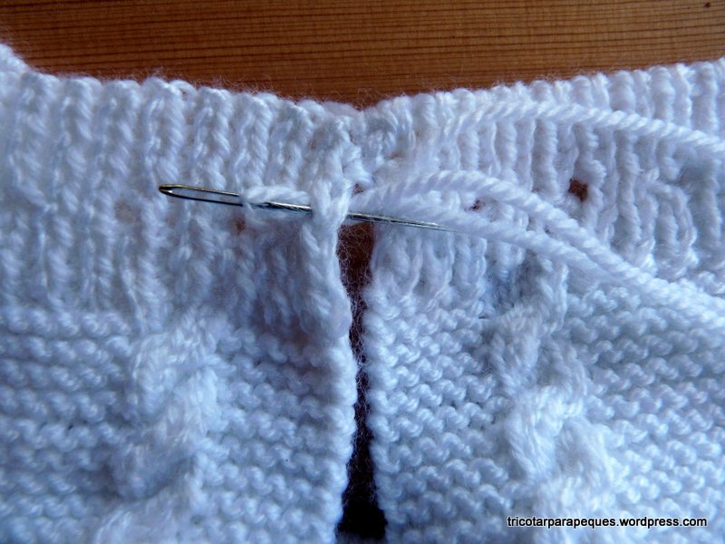 Si la tapeta consta por ejemplo de 7 puntos, tricotados siempre al derecho, recogemos en la segunda aguja los puntos de la espalda y alguno más alrededor del cuello, y vamos tricotando los 6 primeros puntos de una de las tapetas, y el 7º punto se tricota junto con un punto del cuello. Vuelta atrás con los 6 puntos de la tapeta, vuelta, y de nuevo tricotaremos el 7º punto con el siguiente de la espalda. Vamos adelantando hasta coincidir con la otra tapeta, y al final, cerramos los puntos con aguja lanera. Costura invisible, el cuello queda de una pieza.